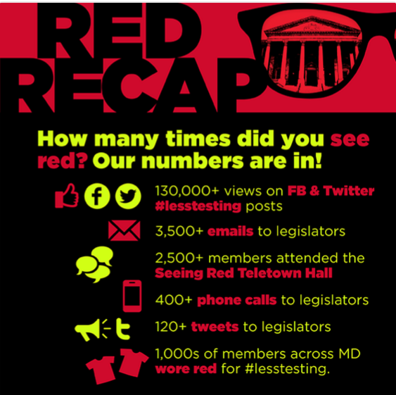 In this past year, MSEA also launched a successful campaign to reduce the amount of classroom time spent on standardized testing. Teachers across the state showed their support for this initiative through wearing red and tweeting #lesstesting during the General Assembly Session.
