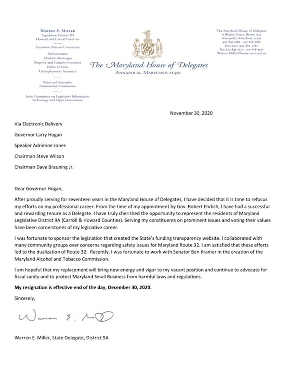 According to Delegate Miller’s resignation letter:
