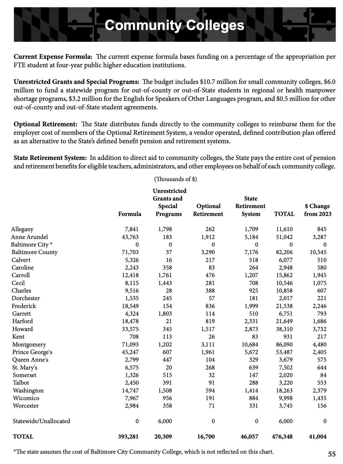 The proposed budget includes $393.3 million provided through the Cade formula. This $38.2 million annual increase in funding reflects an 18.5 percent increase in State support per student at local community colleges. In addition, the governor’s proposed capital budget includes $78.5 million for community colleges.