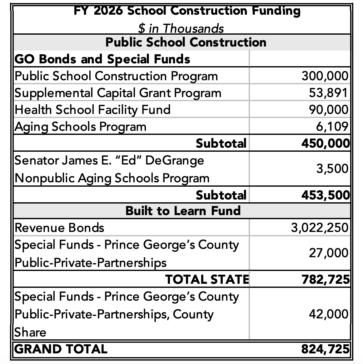The governor’s fiscal 2026 capital budget includes $824.7 million for school construction, a $57.4 million increase over previous plans. This funding meets the legislative intent to allocate $450 million annually for public school construction programs.
